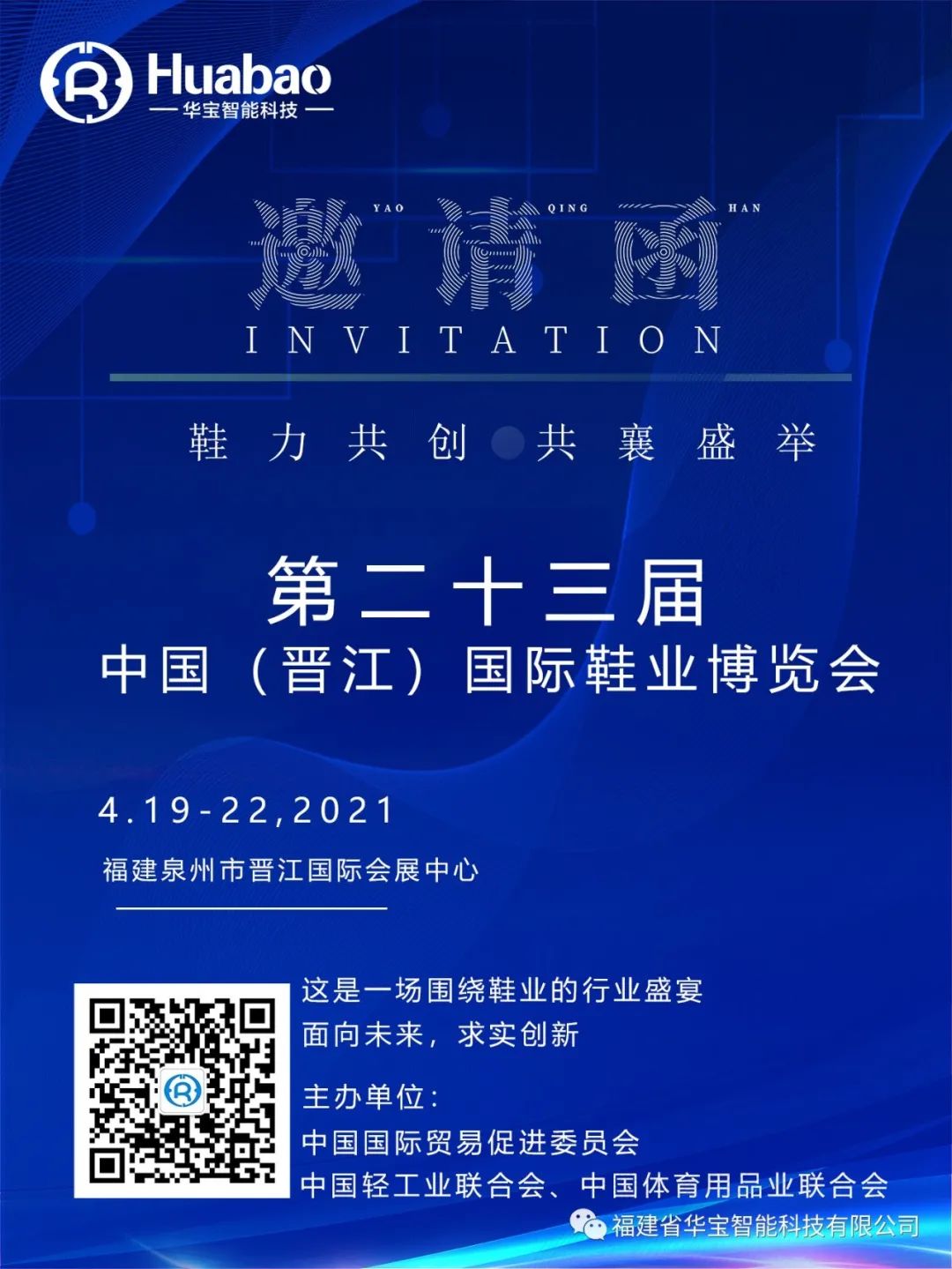 福建省華寶智能科技有限公司將于4月19日-22日參加2021年第二十三屆中國(晉江)國際鞋業(yè)博覽會,屆時誠邀您的蒞臨參觀指導(dǎo)!